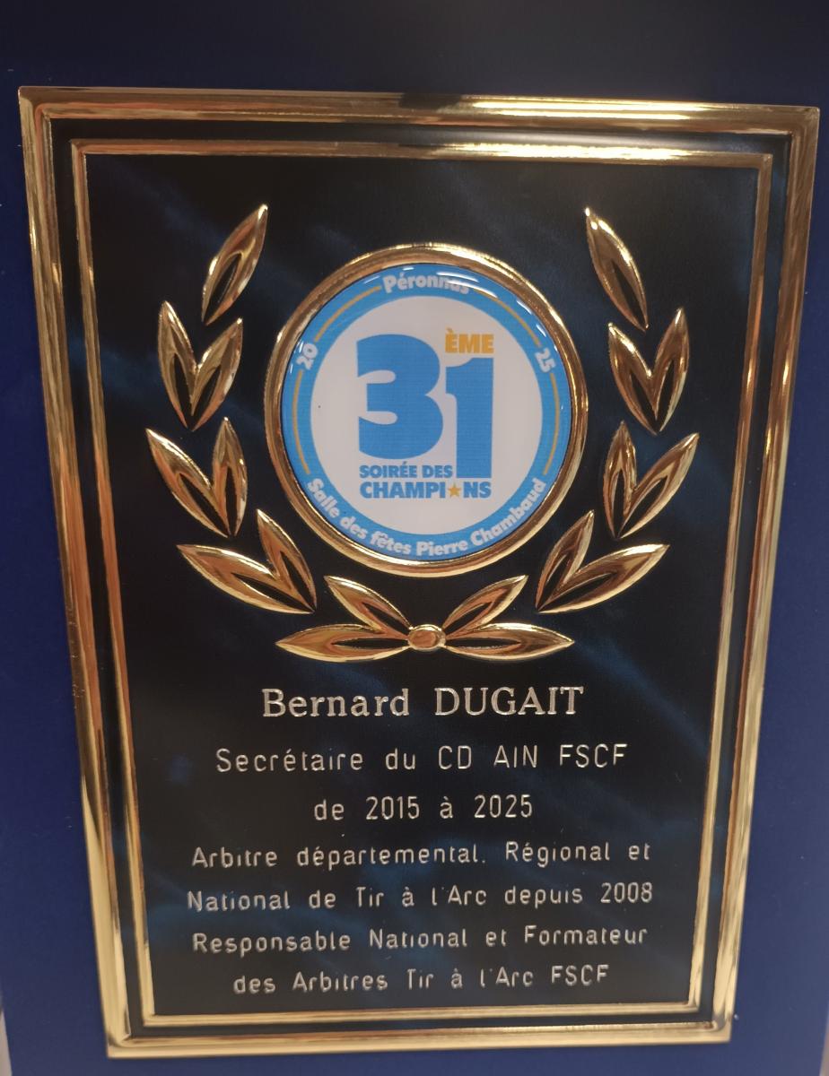 Lors de la 31ème soirée des Champions du CDOS de l'Ain, Bernard DUGAIT a été mis à l'honneur pour ses 10 années de secrétaire du comité départemental de l'Ain de la Fédération Sportive et Culturelle de France ainsi que pour son implication en tant qu'arbitre national de tir à l'arc depuis 2007.
